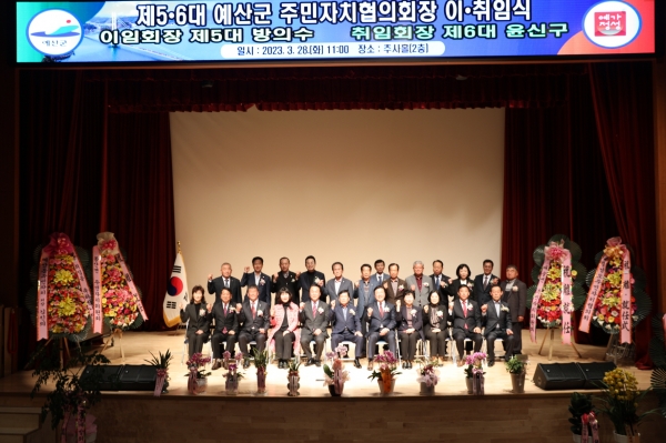 이날 취임식에는 최재구 예산군수와 홍문표 국회의원, 이상우 예산군의회 의장을 비롯한 관내 주요 단체장과 12개 읍·면 주민자치 위원 등 내빈 200여명이 참석했으며 제5대 방의수 회장이 이임하고 제6대 윤신구 회장이 취임했다.