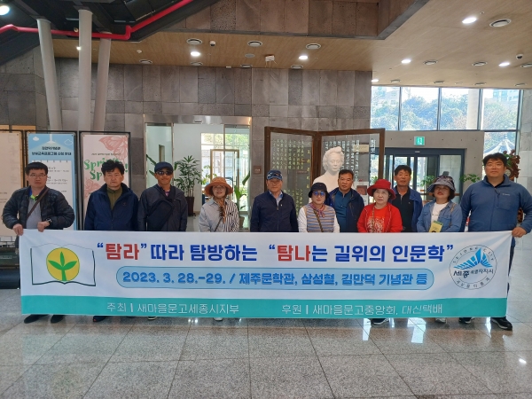 [Ytv영상스토리] 새마을문고중앙회세종특별자치시지부에서는 읍면동 회장 11명이 3월 28일부터 29일까지 1박2일로 제주 원주민의 발상지인 “삼성혈”을 찾아 탐라의 태동에 대한 역사적 가치를 함께 살펴보며 제주의 독특한 여건에서 파생된 신화와 입에서 입으로 전해진 설화를 근간으로 파생된 구비문학과 해녀들의 호오이 호오이 숨비소리를 담은, 생명줄 바다의 삶을 노래한 바당문학, 제주인의 역사와 문화의 정통성이 내포된 제주어를 매개로 하는 제주어 문학 등 삼다도의 독특한 제주문학을 만들어 가며 제주의 지속 가능한 미래와 가능성에 대한 성찰을 통해 무한한 문학적 상상력을 보여주고 있는 제주 문학관을 찾아서 “창조와 도전의 미래전략 수도 세종”의 역사와 미래를 담아내고 세종시민의 희로애락을 잘 표출해 낼 수 있는 문학적 가치 창출을 이루어 낼 수 있는 계기를 마련해보았으며 특히 세종시새마을의 지역가꾸기 봉사현장에서 새마을지도자의 한사람으로써 선각자적 역할을 되새겨 본다는 생각으로 김만덕 기념관을 찾아 나눔과 봉사정신을 계승해 은혜의 빛이 온세상에 퍼질 수 있게끔 세종시의 나눔문화에 이바지 할 수 있도록 하겠다는 각오를 다져 보았다.