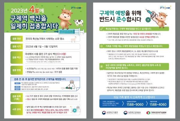 김대환 동물위생방역과 동물방역담당은 “구제역 차단방역은 예방접종이 최선의 방법”이라며 “소중한 농장의 안전을 위해 구제역 일제 예방접종에 적극적인 참여를 바란다”고 말했다.