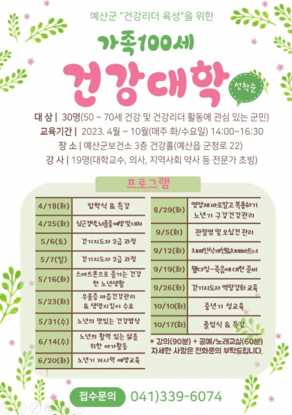 [Ytv영상스토리] 예산군보건소는 50∼70대 군민을 대상으로 ‘가족 100세 건강대학’ 참가자를 모집한다.