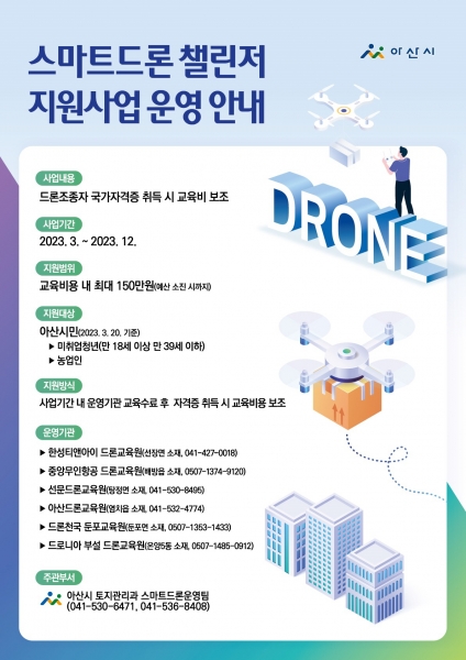 신명식 토지관리과장은 “이번 지원사업이 드론 활용이 필요한 취업준비생과 농업인에게 좋은 기회가 됐으면 좋겠다”며 “아산시가 4차산업혁명 시대를 선도할 수 있도록 드론 산업 활성화에 최선을 다하겠다”고 말했다.