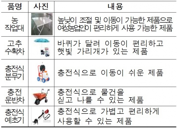 ‘여성농업인 농작업 편이장비 지원사업’은 농촌 고령화에 따른 노동력 부족으로 여성농업인의 농작업 역할이 증대되는 상황 속에, 여성농업인들의 농작업 부담을 경감시켜 농업 경영 능력을 향상하기 위해 추진되는 사업이다.