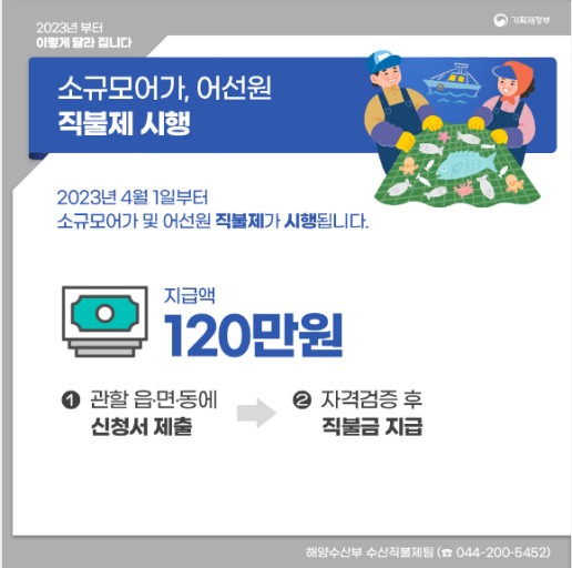 또한, 어선소유자와 1년 중 6개월 이상 고용관계를 유지하거나 6개월 이상 승선해 근로를 제공한 내국인 어선원 등은 ‘어선원 직불제’ 대상에 포함되며 직전년도 기준 어업 외 종합소득금액이 2000만원 미만 동일 세대 내 모든 구성원의 어업 외 종합소득금액의 합이 4500만원 미만 등의 조건을 충족해야 한다.