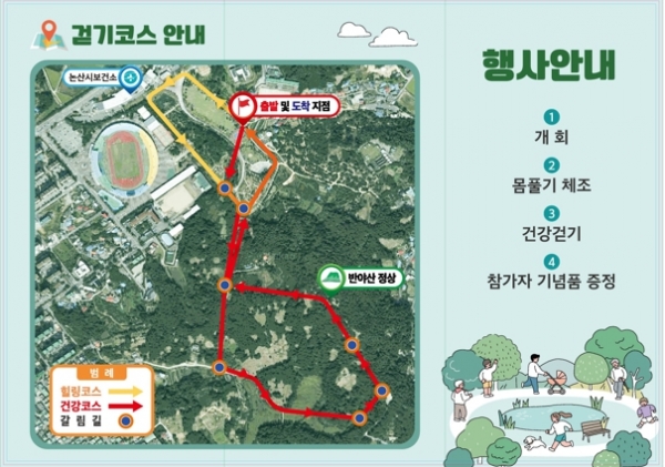 이번 걷기 행사는 집합장소인 시민가족공원 중앙분수대에서 출발해 1km를 걷는 힐링코스와 반야산 일원 4km를 걷는 건강코스로 나눠져 진행된다.