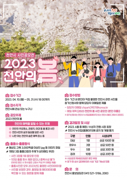 ‘2023 천안의 봄’을 주제로 열리는 이번 공모전은 천안의 주요 명소, 야경 등 풍경 사진이나 천안시민의 삶과 일상을 담은 사진을 오는 5월 31일까지 공모한다.