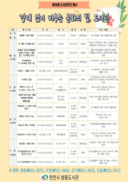 [Ytv영상스토리] 천안시 쌍용도서관이 제59회 도서관 주간을 맞아 쌍용·두정·성거·도솔도서관에서 오는 12일부터 28일까지 다양한 행사를 운영한다고 밝혔다.
