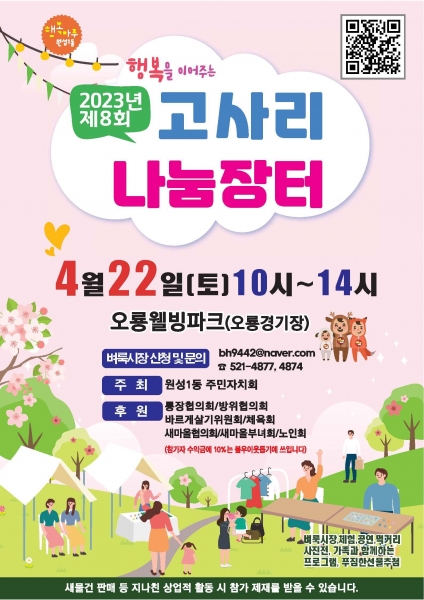 의류, 잡화, 유아용품 등 중고물품과 수제품 등을 판매할 80팀을 모집하며 신청은 QR코드로 하면 된다.