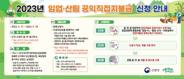 시 관계자는 “올해는 신청 시기가 작년보다 빨라진 만큼 신청 기간에 유의해 임업직불금 혜택에서 누락되는 일이 없기를 바란다"고 말했다.