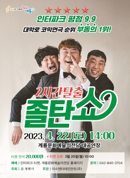 [Ytv영상스토리] 계룡시는 오는 22일 오후 2시 계룡문화예술의전당 대공연장에서 코믹연극 ‘2시간탈출 졸탄쇼’를 공연한다고 밝혔다.