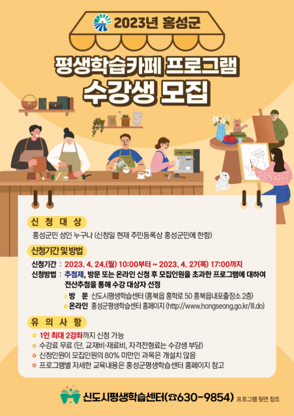 수강 신청 접수는 신도시평생학습센터 방문 접수 또는 홍성군평생학습센터 홈페이지에서 온라인 접수도 할 수 있으며 1인 최대 2강좌까지 신청할 수 있고 수강료는 무료이나 수업에 따른 재료·교재비, 자격 전형료는 수강생 부담이다.