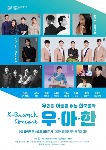 K-브런치콘서트 ‘우.아.한’은 대전국악방송과 공동으로 우리 지역 전통음악 인프라 확충과 국악의 대중화, 생활화를 위해 국내외에서 활발하게 활동하고 있는 연주자들과 함께 클래식, 재즈 등 다양한 장르와의 경계를 넘나드는 음악으로 국악 중심의 동시대 최고의 한국창작음악을 선사하는 공연이다.