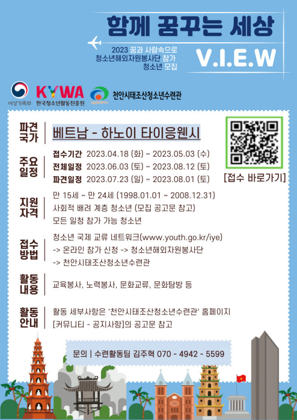 활동에 관한 자세한 사항은 청소년국제교류시스템 해외자원봉사단 모집 공고 또는 태조산청소년수련관, 천안시청소년수련관으로 문의하면 된다.