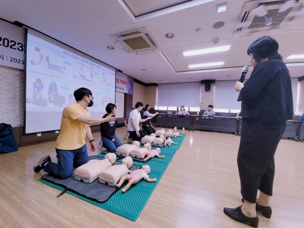 이번 연수는 현장체험학습 및 수학여행 등 학생들의 교육활동 중에 발생할 수 있는 응급상황 행동요령으로 심폐소생술 근골격계 손상 처치 중독 고온에 의한 신체손상 재난안전 등의 과정으로 사고 발생 시 신속히 대처할 수 있는 교원의 역량을 강화하고 안전요원 자격를 갖추기 위한 목적으로 시행됐다.