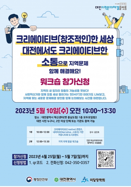 [Ytv영상스토리] 대전시는 오는 5월 10일 오전 10시부터 대전 소통협력공간 1층 모두모임방에서 ‘2023년 대전지역문제해결플랫폼’ 오프라인 의제발굴 워크숍을 개최한다고 밝혔다.