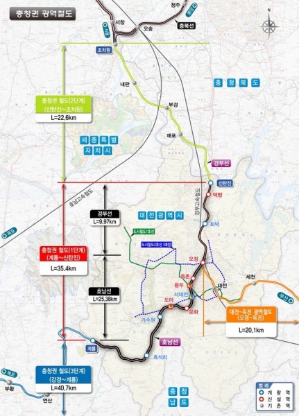 충청권 광역철도 1단계 사업은 계룡에서 신탄진을 잇는 총연장 35.4km 구간으로 2015년 기획재정부의 예비타당성조사를 통과해, 2018년 타당성 조사 및 기본계획을 수립했고 2019년부터 기본 및 실시설계를 추진 중이다.