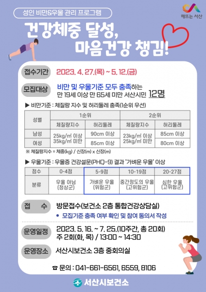 서산시, ‘건강체중 달성, 마음건강 챙김’ 프로그램 참여 희망자 모집