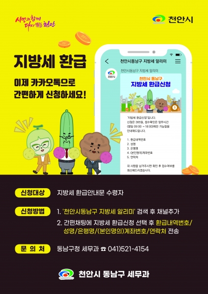 천안시 동남구, 지방세 환급금 카카오톡 신청 서비스 운영