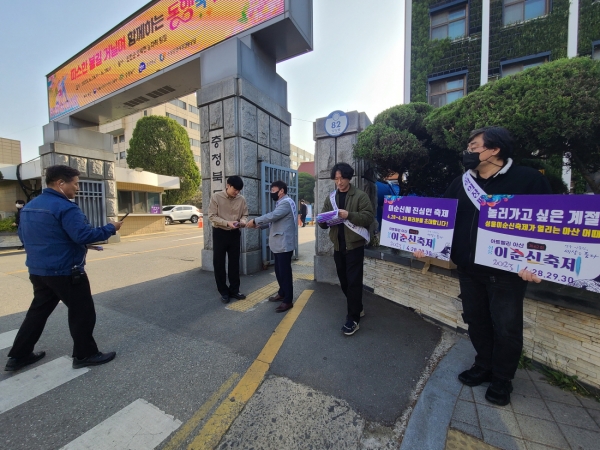 이날 아산시 공무원은 4개 조로 편성해 출근길 공직자를 대상으로 건물 내 주 출입구에서 홍보 어깨띠를 매고 축제 홍보 전단을 나누어 주면서 이순신의 도시 아산을 알리고 새롭게 변화된 이순신 축제에 함께 해주길 호소했다.