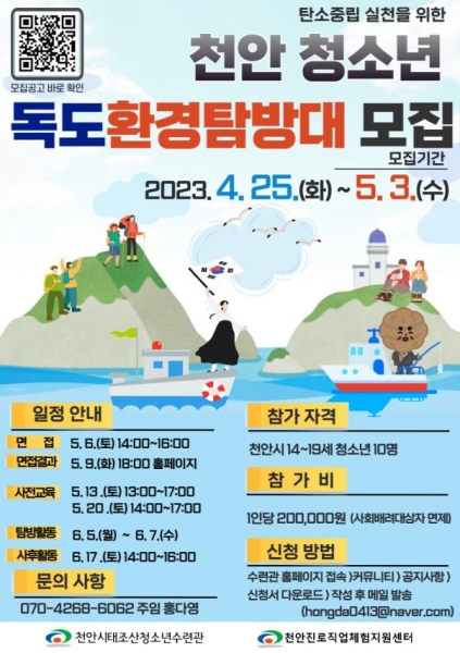 ‘독도환경탐방대’프로그램 참여를 원하는 청소년은 홍보 포스터에 기재된 큐아르코드를 찍어 활동 신청서를 작성해 담당자 메일로 제출하면 된다.