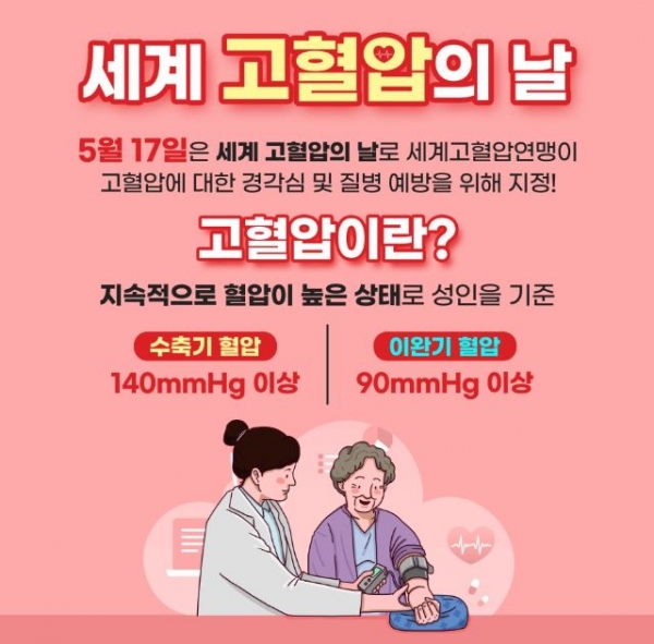 이상각 보건소장은 “고혈압 예방관리를 위해 혈압 수치를 정확히 인지하고 식이조절과 운동을 꾸준히 실천하시길 바란다”며 “앞으로도 지역주민에게 고혈압에 관한 올바른 정보와 다양한 서비스를 제공해 고혈압 예방 활동에 최선을 다하겠다”고 밝혔다.