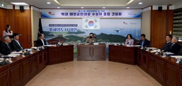 군은 지난 1일 군청 소회의실에서 가세로 군수를 비롯해 역대 태안군민대상 수상자 등 20여명이 참석한 가운데 ‘태안군민대상 역대 수상자 초청 간담회’를 개최했다고 밝혔다.