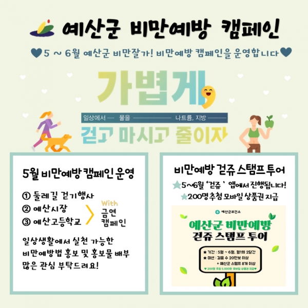 또한 비만예방의 중요성을 홍보하기 위해 5월 중 둘레길 걷기행사 예산시장 예산고등학교 등교길 등에서 지역주민을 대상으로 캠페인을 추진할 계획이라고 전했다.