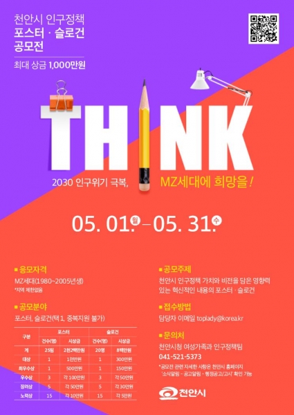 이번 공모전은 지역 제한이 없으며 천안시 인구정책에 관심이 있는 전국 1980~2005년생 MZ세대라면 누구나 참여 가능하다.