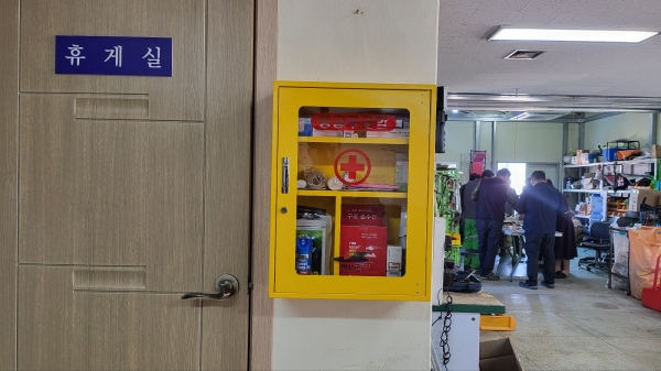 이번 응급처치보관함은 사업장내 확인이 용이한 장소에 철제 보관함을 고정으로 설치하고 산안법에 규정된 구급용구 외 화재대피용 손수건, 화상상처용 스프레이, 산소캔 등을 추가 비치해 다양한 비상상황 발생 시 신속 대응이 가능케 했다는 설명이다.
