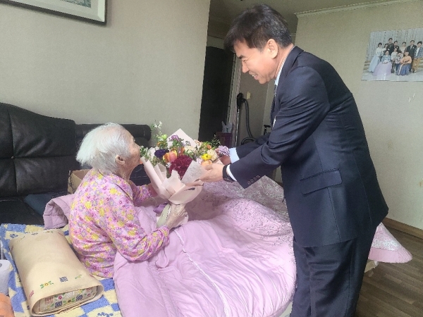 조일교 아산시 부시장은 지난 3일 온양1동에 거주하는 갈복순 어르신 댁을 방문해 장수 축하 인사를 드리며 담소를 나눴다.