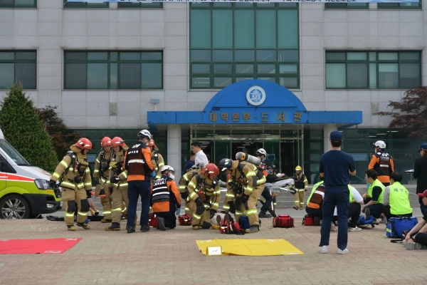 이번 재난대비 상시훈련은 지진으로 인한 건물붕괴와 화재로 다수 사상자 발생에 따른 초기 선착 구급대의 환자 중증도 분류 및 보건소 재난현장 응급의료소 운영 능력 등 구급대응 강화에 중점을 두고 이뤄졌다.