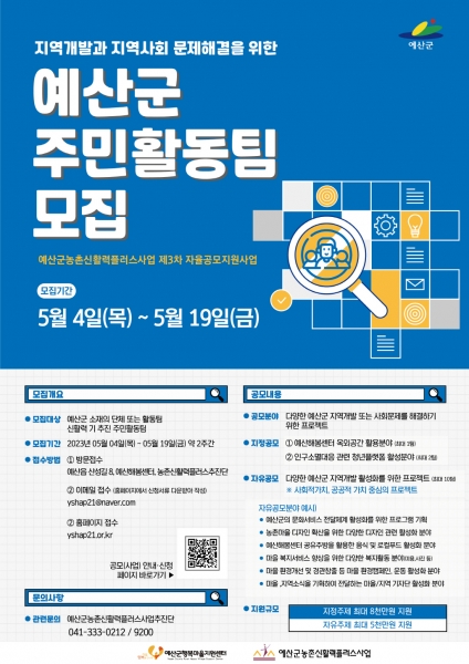 모집기간은 오는 5월 19일까지로 예산군농촌신활력플러스사업추진단을 방문하거나 홈페이지 및 이메일 신청이 가능하며 자세한 사항은 농촌신활력플러스사업추진단으로 문의하면 된다.