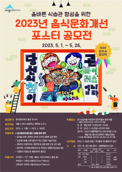 [Ytv영상스토리] 세종특별자치시가 어린이들의 건강한 식생활 습관을 도모하기 위해 지난 1일부터 오는 26일까지 초등학생을 대상으로 ‘2023년 음식문화개선 포스터 공모전’을 개최한다.