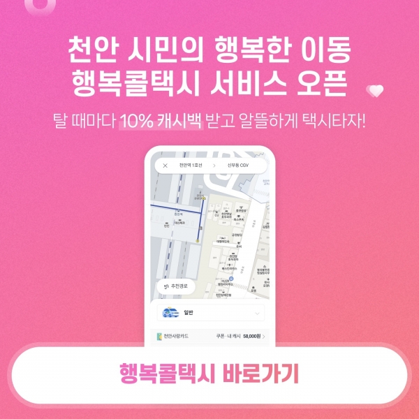 천안시는 언론매체와 온라인 등을 활용해 시민들에게 천안사랑카드 앱 택시 호출 서비스를 적극 알리고 ㈜천안시행복콜택시는 일정 기간 각종 프로모션을 진행하기로 했다.