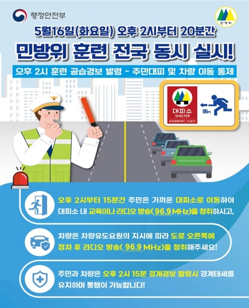 이번 훈련은 공습상황에 대비해 주변 지하 주차장 등 가까운 민방위대피소를 찾아 대피함으로써 비상시 국민행동 요령을 익히고 일상생활에서 안보 의식을 강화하고자 추진됐다.