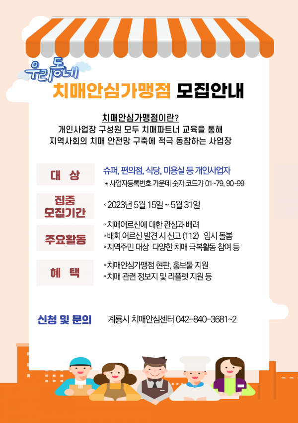치매안심가맹점 모집 관련 자세한 사항은 계룡시 보건소 홈페이지를 참조하거나 치매안심센터에 문의하면 된다.