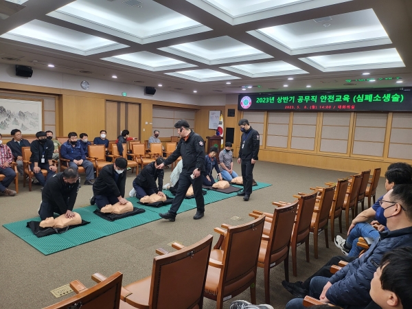 교육은 청사 관리 공무직원들이 응급상황 발생 시 신속한 구호조치가 가능하도록 심폐소생술 자동심장충격기 사용방법 기도폐쇄 시 응급처치 요령 등으로 진행됐다.