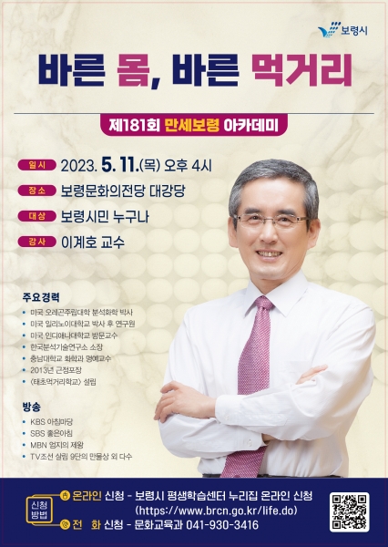 [Ytv영상스토리] 보령시는 오는 11일 오후 4시 보령문화의전당 대강당에서 이계호 교수를 초빙해 ‘바른 몸, 바른 먹거리’라는 주제로 제181회 만세보령 아카데미 강연을 개최한다.