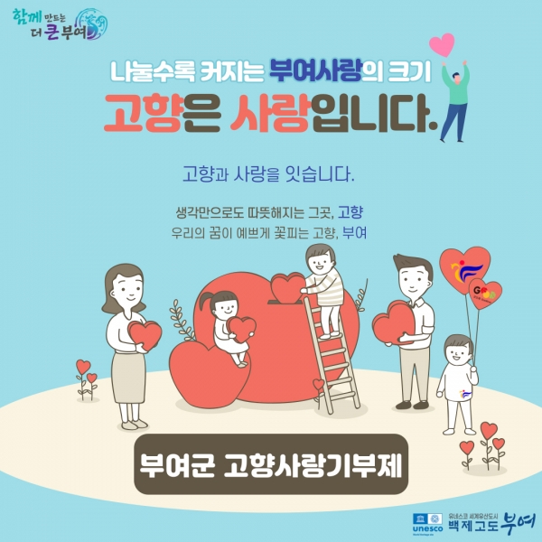 박정현 부여군수는 “고향사랑기부제의 시행목적이 지역의 선순환적인 경제구조를 만드는 데 있다”며 “이를 바탕으로 아동과 청년이 함께 미래를 꿈꾸고 공동체와 군민이 함께 하는 하나의 브랜드를 구축해, 지역 균형발전을 선도하는 자치단체가 되겠다”고 밝혔다.
