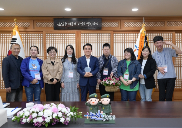 [Ytv영상스토리] 논산시 취암동에 위치한 장애인보호작업장 ‘발그래일터’의 대표자와 근로 장애인 8명이 11일 논산시청을 찾았다.