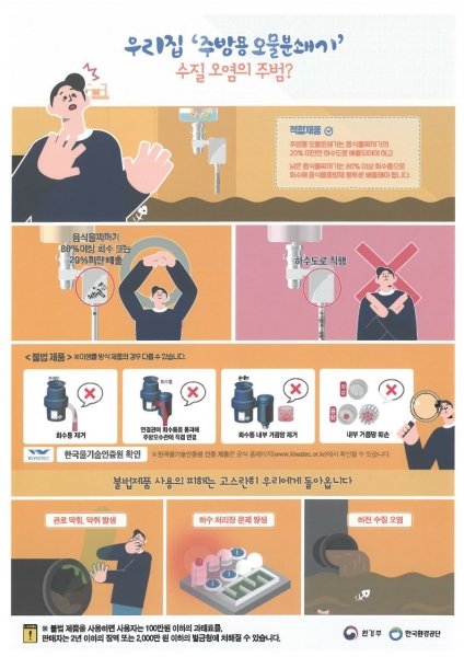 수도사업소장은 “주방용 오물분쇄기 설치 시 반드시 한국물기술인증원 인증 제품인지 확인해야 한다”며 “오물분쇄기 불법 사용으로 인한 피해는 고스란히 자녀와 가정에 돌아간다는 사실을 인식하고 불법 사용 근절을 위한 시민들의 협조를 부탁드린다”고 말했다.