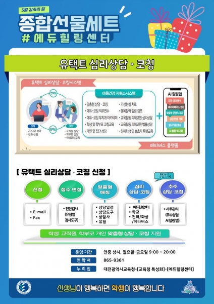 이번 종합선물세트는 에듀힐링센터에서 운영하고 있는 정책 중에서 심리상담·코칭 관련 프로그램과 교육활동보호 관련 프로그램으로 총 13종을 제공했다.
