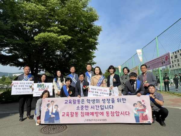 이날 행사는 학생의 인권과 선생님의 교권이 모두 존중받는 학교문화 형성을 위한 홍보활동으로 아산교육지원청 직원들이 교육활동 침해 사례 및 예방을 위한 문구를 들고 등교하는 학생들과 상쾌한 아침 인사를 나누며 진행했다.