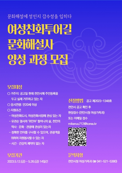 천안시, 여성친화투어길 문화해설사 양성과정 모집
