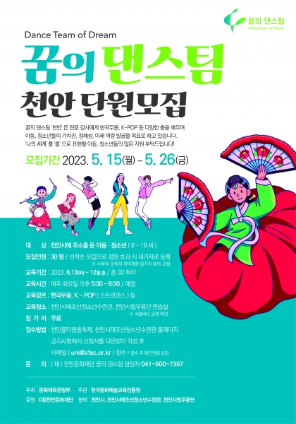 꿈의 댄스팀 모집대상은 천안시에 거주하는 8~19세 아동·청소년으로 신청방법은 천안문화재단 홈페이지 공지사항 내 지원신청서를 다운로드해 작성 후 이메일로 전송하면 된다.