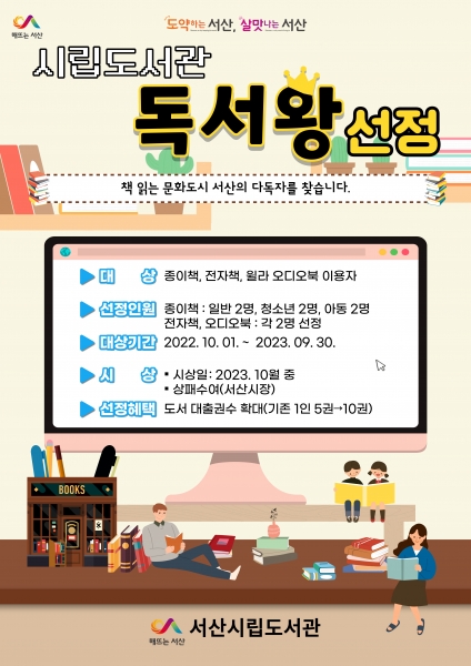 독서왕 선정과 관련한 자세한 사항은 서산시립도서관 누리집나 운영팀으로 문의하면 된다.