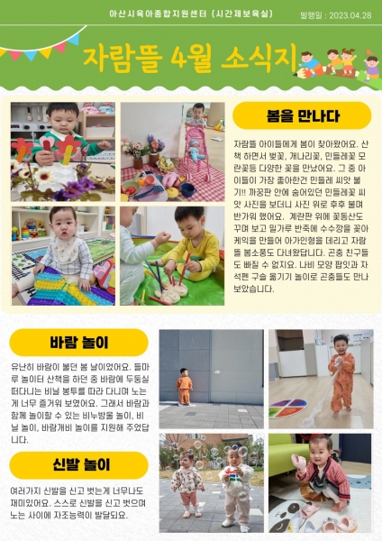 매월 아산시육아종합지원센터에서 영유아 시간제 보육실 이용 모습을 담은 소식지를 발행하고 있으며 이용 신청은 임신·육아 종합 포털 아이사랑에서 하면 된다.