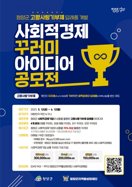 [Ytv영상스토리] 청양군지역활성화재단이 군내 사회적경제 기업 제품의 인지도 향상과 고향사랑기부제 활성화를 위해 전 국민을 대상으로 ‘사회적경제 꾸러미 아이디어 공모전’을 진행하고 있다.