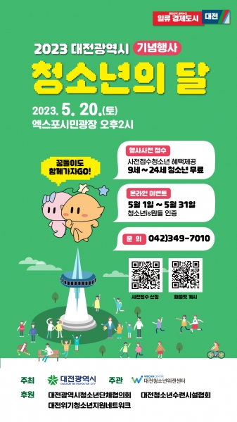 [Ytv영상스토리] 대전시가 주최하고 대전청소년위캔센터가 주관하는 2023년 청소년의 달 기념행사가 5월 20일 오후 2시에 대전엑스포시민광장에서 개최된다.