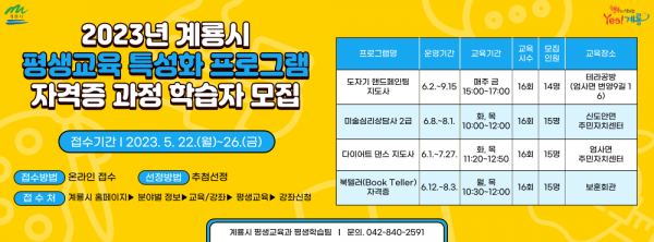 [Ytv영상스토리] 계룡시가 22일부터 오는 27일까지 5일간 ‘2023년 평생교육 특성화 프로그램 자격증 과정’ 학습자를 모집한다고 밝혔다.