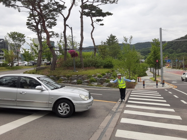 아울러 군청 진입로 횡단보도를 이용하는 어린이와 몸이 불편한 어르신의 안전한 통행이 가능하도록 돕고 차량 정체 시 교통정리를 담당하는 등 교통 지킴이 역할도 병행해 항상 고마움과 반가움의 대상이 되고 있다.